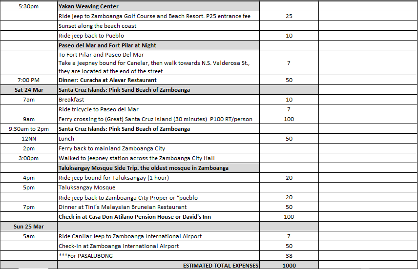 Here’s my suggested 1,000pesos backpacking challenge budget itinerary for a 3 days and 2 nights Zamboanga trip.